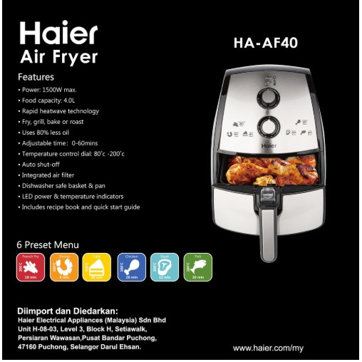 Pre Order Haier Ha Af40 Air Fryer Extra Large Capacity 4 0l 1 Year Haier Warranty Shopee Malaysia